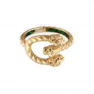 С каплевидным силуэтом серьги, демонстрируют мотив Диониса в желтом 18-ти каратном золоте с акцентом на бриллианты (0,2ct), зеленую эмаль и цавориты (1.45ct, а также с мотивом Диониса, ожерелье из желтого 18-ти каратного золота, украшенного зеленой эмалью и цаворитом (0,16 грамма). Два браслета завершают комплект. Вершину каждого из них венчают три смыкающихся головы тигра в желтом 18-ти каратном золоте с глазами из цаворита (0.18ct). Украшенные зеленой эмалью вдоль внутреннего края, свободный стиль этих браслетов, может легко сочетается с другими коллекциями от Gucci. Более тонкий браслет, также может прекрасно сочетаться с часами из коллекции Dionysus.
