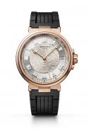 Символизируя это новое поколение, Marine 5517 отображает дату у деления 3 часов, расположенного в часовой шкале, представленной римскими цифрами. Цифры выполнены из люминесцентного материала, такого же, как разметка минут и стрелки Breguet с открытым наконечником. Морская тематика отображена секундной стрелкой с буквой «В» в переосмысленной версии соответствующего морского сигнального флага. Breguet предлагает несколько вариантов модели Marine 5517 - из белого золота, розового золота и титана. Титан был выбран за его исключительные свойства, а также устойчивость к коррозии и соленому воздуху. Это также легкий и особо прочный материал. Титановая версия имеет синевато-серый циферблат в виде солнца с лучами. Циферблаты моделей из белого золота и розового золота имеют гильошированный узор «волна», который не оставляет никаких сомнений относительно того, какой коллекции принадлежат эти часы. Морской дух этой модели с автоподзаводом отражен и на тыльной стороне, где дизайн отдельного ротора выполнен в виде судового руля. Механизм, который можно видеть через сапфировое стекло на задней крышке, гильоширован и напоминает палубы. Для всех этих моделей Breguet предлагает различные варианты ремешков. В зависимости от модели доступен коричневый или синий кожаный ремешок, в то время как приверженцы более спортивного стиля могут выбрать ремешок из каучука.