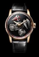 COSMIC ART - Создания внеземных цивилизаций, включающие внеземные фрагменты (метеориты), подлинные космические материалы, полученные в результате покорения космоса, и предполагающие сотрудничество с легендарными космонавтами и астронавтами. Два космических корабля сражаются под куполом из сапфирового стекла, обращаясь друг к другу восемнадцать раз в час: верхний космический корабль совершает оборот по часовой стрелке каждые пять минут, в то время как нижний корабль поворачивается в противоположном направлении, совершая оборот против часовой стрелки каждые десять минут. Между тем две постоянно вращающиеся космические станции создают мощную защиту от гравитации.