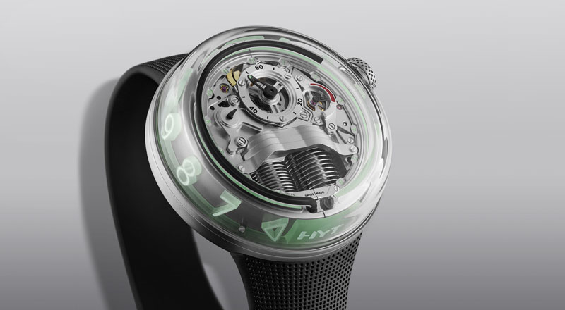 Совершенно новый запатентованный калибр 501 является воплощением противоположностей, притягивающих к гармонии. Три года разработки, проведенные в основном за пределами зоны часового комфорта, привели к единому механизму, который использует потенциально парадоксальную мощь механических и жидкостных технологий. Щедрые размеры и прозрачность доказывают, что результат так же прекрасен, как и эффективен. HYT любит визуализировать время в движении; новаторское движение H5 - это эстетический и технический скачок в том же направлении. Механизм с ручным подзаводом задает постоянный темп и высвобождает точно необходимое количество энергии для двух контрастных не смешивающихся жидкостей, которые текут внутри капиллярной трубки, чтобы представлять недавнее прошлое и ближайшее будущее. Видимый через заднюю крышку сапфирового стекла, камера сложной формы предлагает тринадцать различных возможностей для регулировки и индексации часовых и минутных индикаторов, обеспечивая их работу как единое целое. Изогнутый рычаг большого размера соединяет сотрудничающие элементы механизма. Это организует сложную цепную реакцию, в результате которой калибр толкается в регулирующий сильфон со стенами, в четыре раза тоньше человеческого волоса, чтобы начать следующий двенадцатичасовой путь времени. HYT является признанным мастером, позволяющим искусству и науке разделить одно пространство.