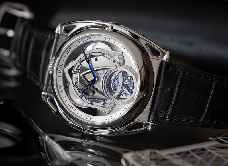 Двусторонние часы занимают особое место среди часов высочайшей сложности. Несмотря на кажущуюся простоту этих часов, De Bethune явно не пошла по самому легкому пути, создав модель с двумя циферблатами, которые олицетворяют настоящий вызов часового искусства. Виды сзади и спереди демонстрируют подлинную трансформацию. Это была идея, которая на протяжении многих лет формировалась в сознании Дени Флажоле, который был убежден, что она откроет ему беспрецедентную область исследований и возможность предложить иную, современную интерпретацию. Так же, как изобретение его силиконового баланса и балансирной пружины, а также знаменитых плавающих ушек, это позволило ему внести еще один вклад в развитие часового искусства. На лицевой стороне DB Kind of Two Tourbillon находится циферблат изящного современного дизайна с центральными часовой и минутной стрелками, а также турбийон в положении «6 часов» с 30-секундной индикацией. Была проделана обширная работа по объединению полированных, изогнутых форм, матовых или глянцевых компонентов, различной толщины и уровней, что позволило создать ощущение простора и оптимального объема, учитывая минимальную высоту, доступную для часов с турбийоном. На другой стороне виден циферблат, основанный на более традиционном эстетическом вдохновении, с тонко гильошированной вручную центральной частью, окруженной цифрами, уже присутствующими на циферблатах моделей De Bethune, таких как DB8 и DB10. Турбийон с секундной стрелкой исчез, и на этом циферблате часы, минуты и, что еще более удивительно, секундные стрелки расположены по центру. Это представляет собой чрезвычайно тонкую техническую задачу, которая не всегда заметна с первого взгляда, и в этом заключается элегантность этих часов.