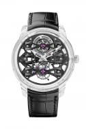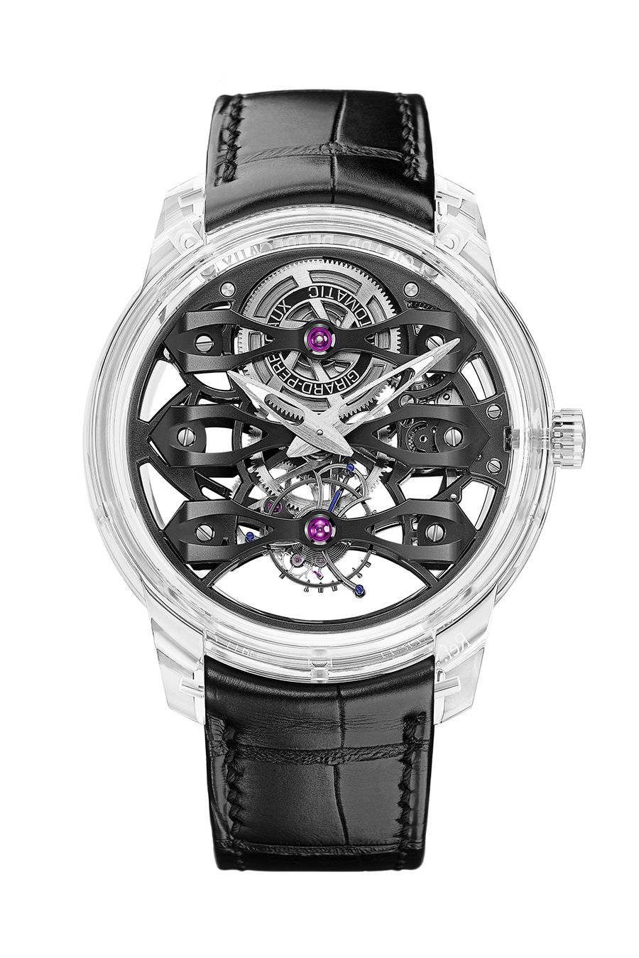 Сложная внутренняя работа нового механизма Neo-Tourbillon с тремя мостами полностью раскрывается через корпус, выполненный из сапфирового стекла - впервые для Girard-Perregaux. Архитектура буквально взрывается с яркостью. Таким образом, турбийон с современным духом выходит на световой спектр. Как и его удачно выбранное имя ... Quasar - это сверх светящаяся область в центре галактики, накапливающаяся вокруг черной дыры. Странное сочетание света и тьмы, которое Quasar выражает в часовом искусстве Girard-Perregaux. 2019: Girard-Perregaux, эстет невидимого, исследует Космос, сущность времени. Швейцарская часовая мануфактура представляет новую вселенную, инновационные материалы и неожиданные сложности в своих основных коллекциях, объединенных единой темой: «Earth to Sky». Сквозь эти прозрачные стены калибр GP9400-1035 раскрывает свою ажурную конструкцию, очень похожую на звезду, видимую с помощью телескопа. Это движение высокого часового искусства притягивает взгляд как черная дыра и взрывается светом, освещая промежуток между его компонентами. Quasar, лишенный какой-либо непрозрачности, позволяет фотонам свободно играть на своих матовых поверхностях и на изогнутых кривых.