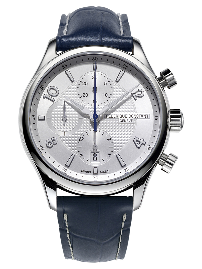 Размещенные в 42 мм стальном корпусе, две новые модели Runabout RHS Chronograph Automatic имеют трехкомпонентный хронограф (12 часов - 6 часов - 9 часов) с автоматическим калибром FC-392, что обеспечивает запас хода 46 часов Швейцарское происхождение этих часов раскрывается на гильошированном циферблате - традиционная отделка швейцарского часового искусства - антрацитовый-серый или посеребренный, в зависимости от издания. Две светящиеся стрелки скользят по окну даты в 6 часов и дополняются большой центральной секундной стрелкой из вороненой стали, напоминающей цвет великих итальянских озер. Этот морской оттенок подобран в строчках на версии, которая поставляется на черном ремешке из телячьей кожи и украшает ремешок на второй модели, которая отделана серым верхним швом.
