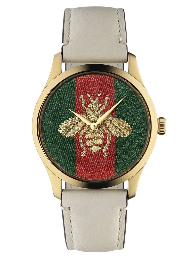 Циферблаты обеих моделей имеют символическую паутину Gucci из нейлона в цветовой гамме с зелено-красно-зелеными полосами и расшиты пчелиным мотивом Gucci из металлической золотой нити. Дизайн заключен в корпус из желтого золота PVD. Сапфировое стекло защищено антибликовым покрытием. Новые часы выпускаются в двух размерах: 27-миллиметровая версия для маленьких запястий и 38-миллиметровая версия унисекс. Обе модели швейцарского производства и водонепроницаемы до 50 метров. Легкий в ношении стиль, который придаст подлинный штрих Gucci любому образу, он станет идеальным компаньоном для повседневной летней одежды.