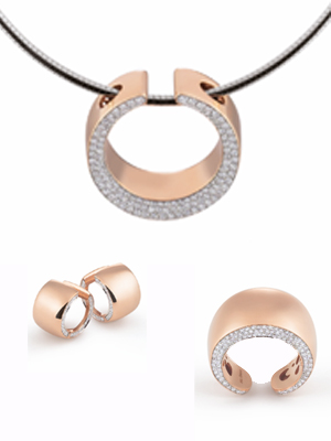 Основная тема, которая пронизывает внешний образ украшения, это форма не замкнутого круга. Безусловно, эта тема обыгрывалась не однократно и многими как известными, так и малоизвестными ювелирными домами, но интерпретация мастеров бренда AlCoro заслуживает отдельного внимания, поскольку их работа позволила в очередной раз преподнести интересный вариант уже достаточно использованной темы в образах украшений.