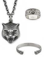 Ювелирный дом Gucci выпуская украшения, не забывает и мужской половине человечества. Достаточно широкий выбор украшений для мужчин пополнился еще одним интересным и ярким объектом в лице комплекта состоящего из кулона. кольца и браслета. Агрессивная и мужественная тема диких животных часто встречается в ювелирных украшениях и вот очередная волна анимализма вдохновила и ювелирный дом Gucci. Стоит отметить, мастера бренда ответили на данное вдохновение достаточно достойно и интересно.