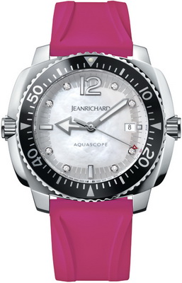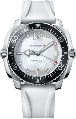 | Новая коллекция Aquascope произведённая мануфактурой JeanRichard предназначена дайверам, для которых самоконтроль является жизненно важным требованием и часы становиться незаменимым спутником в тишине морских глубин. Полированный или матовый корпус имеет двунаправленный вращающийся безель для определения оставшееся время погружения: критические указания для тех, кто занимается этим видом спорта. AQUASCOPE также предлагает женские модели с белым перламутровым циферблатом . Бриллиантовые индексы на циферблате с белым, серым или розовым ремнями выглядит очень «гламурно». Часы в мануфактурном корпусе из нержавеющей стали (40 х 44,50 мм), обеспечивающем водозащиту до 300м, оснащены механизмом с автоподзаводом, выпускаются с чёрным, белым, серебристым и тёмно-синим циферблатом, а также палитрой ярких разноцветных ремней. |