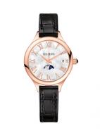 Особого шарма часам придает, конечно же, индикатор фаз луны который размещен в нижней части циферблата в районе 6-ти часов. Вид данного элемента на фоне перламутрового циферблата становиться еще более выразительным и поэтичным, придавая часам не только дополнительной функциональности, но и неповторимой красоты и шарма.
