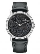 Корпус часов Villeret 6612-3433-63B выполнен из платины. Водонепроницаемость 3 АТМ. Часы Villeret Métiers d’Art «Большая волна» установлены на ремешок из телячьей кожи серого цвета.