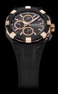 Швейцарская часовая компания Concord анонсирует выпуск новинки C1 Black and Gold, имеющей круглый корпус диаметром 47 мм и толщиной 5 мм из титана с черным PVD покрытием. Оснащен корпус фиксированным титановым безелем с 8 вставками из 18-каратного розового золота. Завинчивающаяся золотая заводная головка украшена логотипом марки на ее черном керамическом торце. Кнопки хронографа, выполненные из керамики, размещены на 2 и 4 часах. Водонепроницаемость – 200 метров. На черном циферблате с «кирпичной» отделкой отмечены накладные часовые метки и стрелки, покрытые люминесцентным покрытием белого цвета. На фланце циферблата находится тахиметрическая шкала. Счетчики хронографа расположены у меток 12, 6 и 9, а апертура даты – на 3 часах.На лицевой стороне корпуса и на его задней крышке установлено сапфировое стекло с антибликовым покрытием. |