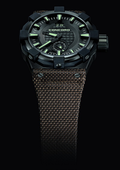 В модели часов C1 Big Date Radar предусмотрено абсолютно все. Энергичный стиль, закаленный характер, подчеркнутая индивидуальность. Часы C1 Big Date Radar смело заявляют о своем стиле стальным корпусом с черным PVD покрытием, сконструированным в соответствии с принципами прочности, являющимися символом марки Concord. Над безелем возвышаются восемь "бастионов", облаченных в черный каучук. Циферблат черного цвета играет с контрастами и рельефом, обеспечивая превосходную читаемость времени. Пилотирование этого нового часового аппарата обеспечивается механизмом автоматического подзавода с резервом хода в 44 часа. Через прозрачную заднюю крышку корпуса можно увидеть ротор с отделкой Cotes de Geneve. Этой великолепно налаженной механике вторит невероятно прочный браслет из техноволокна цвета хаки, придавая еще больше энергии этой содержательной и авторитарной модели. черным каучуком |