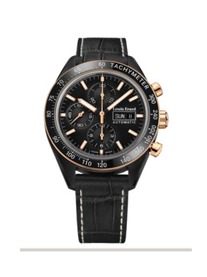 Модель отображает часы, минуты, секунды, дату, день недели и обладают хронографом. Особый внешний вид часам задает циферблат черного цвета с контрастно нанесенными на него белыми и позолоченными метками часов и хронографа. Корпус также покрыт чернением по технологии PVD и выразительно смотрится на фоне вставок покрытых розовым золотом. Размер корпуса 44 мм. Данные визуальные приемы соответствуют всем тенденциям современного часового дела и выразительно подчеркивают индивидуальность новинки.