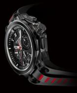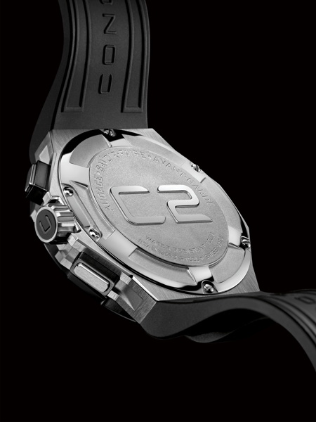 Новое детище серии Concord, хронограф C2, несет в себе все признаки фирменной марки, сумевшей задать тон в сфере механических часов Корпус из нержавеющей стали с черным ПВД покрытием диаметром 43 мм радует гармоничными пропорциями. Уменьшенная толщина усиливает впечатление тонкости и выгодно подчеркивает удачное сочетание углов и изогнутых линий. Корпус новой конструкции экстраполирует концепцию осей Concord без мостов, еще больше подчеркивая его целостность с браслетом: новые трубчатые горизонтальные оси буквально укореняют его в корпусе. Включенный в корпус браслет становится его неотъемлемым конструктивным элементом, оптимально скользя по запястью, прекрасно регулируется и уникален по исполнению. Нижняя часть корпуса с водонепроницаемостью до 100 м выполнена в форме сейфа на 37 камнях и защищает механический ход с автоподзаводом, имеющим частоту 28000 полуколебаний в час. Стрелки с люминесцентным покрытием обеспечивают оптимальную читаемость. Одна центральная стрелка кроваво-красного цвета перекликается с цветом рисунка на каучуковом браслете и напоминает о том, что время может ранить. На диске вокруг циферблата расположены знаменитые выступы, свойственные часам C1 с самого начала, придавая им роль указателя. В идеальном равновесии расположены циферблаты хронографа в промежутке на 6 и 9 часов с вращающимся диском маленькой секундной стрелки в положении на 3 часа. Наконец, окошко даты расположено в положении на 6 часов. Оконечности с тонкой шероховатостью и бархатистые на ощупь в закруглениях, придают циферблату особую выразительность и глубину Хронограф C2 представлен в различных исполнениях, одно из которых, с отделкой камнями, предназначено специально для женщин.