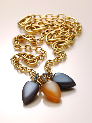 Украшения от франкфуртского ювелирного бренда Buchwald всегда поражают своей выразительностью. Именно этого эффекта добивается владелица марки Ангела Бухвальд, которая использует самые яркие драгоценные «краски». Новые украшения из коллекции Culture Club, представленных в этом году, особенно экстравагантны и великолепны благодаря фирменным приемам работы с яркими драгоценными камнями, как например, их обработка в форме сердца. Оникс и белый агат, лунный камень и дымчатый и розовый кварц играют ведущие «роли» в новых украшениях Culture Club. Это ожерелье, подвески и серьги из белого и розового золота с бриллиантами; кольца из розового золота с белыми или коньячными бриллиантами; и даже шейное норковое украшение с подвесками и серьгами из розового золота с бриллиантами.