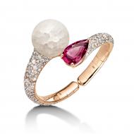 Трио украшений из драгоценных камней, включающее кольцо, браслет и серьги, несет на себе отпечаток элегантного стиля Фаваза Груози через призму характерной цветовой гаммы и огранок. Дом de GRISOGONO смело ставит круглую огранку наравне с наиболее престижными огранками, применяемыми в его творениях: грушевидной и классической.