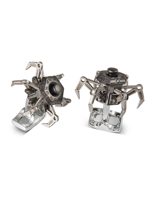 Запонки Drone Cufflinks Deakin & Francis выполнены из нескольких видов металлов. При их создании использовалась высоколегированная сталь, алюминий и латунь. Шесть ног фантастической станции прикреплены таким образом, что могут двигаться при нажатии на них.