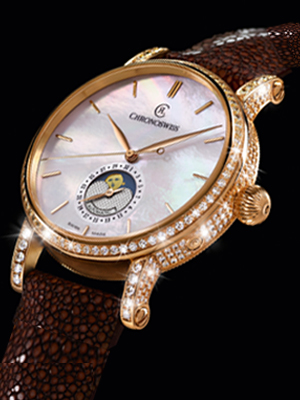 Moon Phase Diamonds Chronoswiss - это изящные и броские черты, сочетание дорогостоящих материалов, выдержанный контраст в инкрустации и неподкупно роскошный вид.
