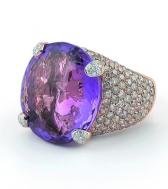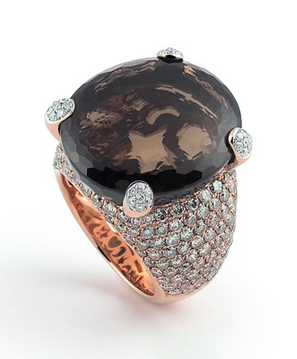 Серию роскошных колец из розового золота Fairy представила ювелирная компания Al Coro Центральное место в изделии почетно занимает крупный полудрагоценный камень - дымчатый кварц или аметист, прочно удерживаемый золотыми "лапками", усыпанными бриллиантами. Внутренняя сторона кольца декорирована прекрасным золотым узором, который таинственно переливается и отражается в глубине центрального камня. Красота и яркий цвет камня подчеркнут бриллиантовой россыпью, общей каратностью около 4,0 карат |