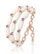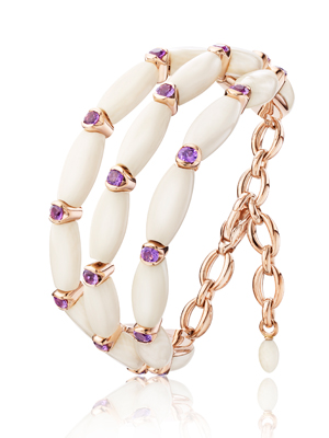 Сочетания достаточно интересные и позволяющие достигать совершенно разных образов, диаметрально противоположных и при этом до безумия красивых. Комплект из розового золота и украшенный бриллиантами, комплект из розового золота со вставками бирюзы и с бриллиантами, комплект из розового золота со вставками из слоновой кости и украшенный аметистами, комплект из белого золота украшенный россыпью бриллиантов.