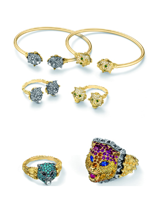 Головы тигра украшают, в том числе и параба-топаз, черная шпинель и жемчуга, сияние золотисто-желтого цитринового кварца, фиолетовых и малиновых рубинов. Серые бриллианты и жемчуг придают особый вид украшениям. Эти фантазии наполненные остроумием и воображением, источают характер и творчество, особенно когда они смешаны в смелой, красивой форме.