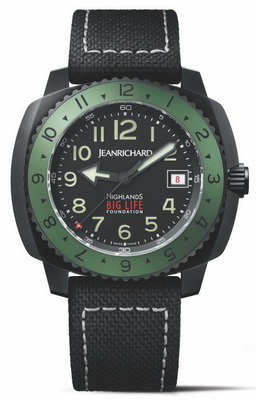 | JeanRichard выступают на сохранение африканской экосистемы и вместе с известным фотографом дикой природы Ником Брандтом выпустили часы JeanRichard Highlands Big Life. Таким образом, бренд выразил солидарность с благотворительным фондом Big Life Foundation Часы диаметром 44,5 мм изготовлены из нержавеющей стали с черным PVD-покрытием. Безель зеленого цвета вращается в двух направлениях. Черный матовый циферблат с арабскими цифрами. Модель оснащена автоматическим механизмом JeanRichard JR1000 с функциями индикации часов, минут, секунд и даты. Тканевый ремешок черного цвета с белой прострочкой. Часы выпущены лимитированным тиражом 100 экземпляров. |