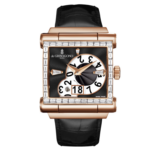 Часовой Дом de Grisogono выпустил обновленную версию своей флагманской модели Instrumento Grande Open Date. Характерная черта новинки – два больших диска, на пересечении которых находится окно даты. В отличие от общепринятой практики закрывать все цифры, кроме тех, что показывают текущие данные, в новой модели Instrumento Grande Open Date открыты все диски: «Нам есть что показать и нечего скрывать», - говорит глава марки Фаваз Груози. Также открытым является механизм часов, причем с неожиданной боковой части корпуса. Диски индикатора даты гармонично размещены на циферблате, декорированном гильоше, а прямоугольный корпус часов из розового золота традиционно крупный (48,2 х 41,11 мм). Как и прежде, компания de Grisogono предлагает несколько версий модели Instrumento Grande Open Date, которые варьируются от классической роскошной версии с ремешком из крокодиловой кожи, но есть и стильные городские модели с ремешками из кожи ската с различными цветовыми вариациями циферблата.