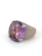 Кольцо с огромным и чистым аметистом и усеянное россыпью бриллиантов разного цвета и величины.