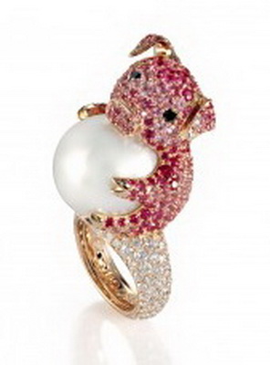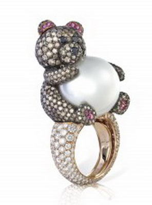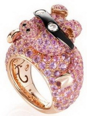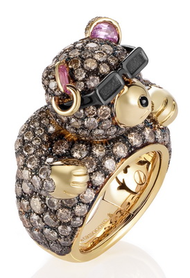Фаваз Груози, глава ювелирной компании De Grisogono, всегда славился своим отменным чувством стиля и превосходным чувством юмора. На выставке BaselWorld 2013 он представил шутливую, «мультяшную» лягушку — кокетку и модницу. Кожа квакши состоит из изумрудов, глаза — из аметиста, губы — из рубина, а на шее у модницы — золотые бусы. В этой веселой коллекции присутствуют и другие персонажи - обезьяны, свинки, мишки и т.д. |
