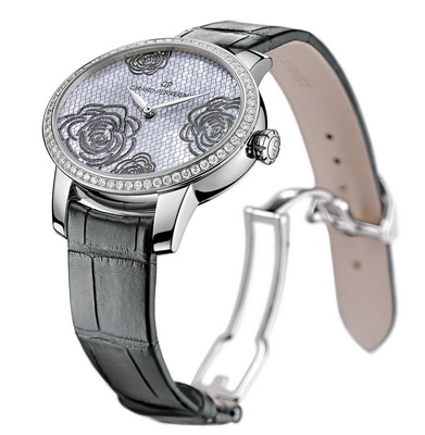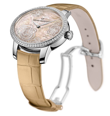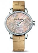 Часы из уникальной коллекции Cat's Eye, моментально узнаваемые по характерному овалу их корпуса, предназначены для женщин, которые знают толк в часах, относящихся к Haute Horlogerie, высшей категории в часовом искусстве. Впервые с помощью особой техники циферблат этих часов оформлен пионами. Считается, что пионы, выращиваемые в Китае на протяжении тысячи лет, были первыми декоративными цветами. Кажется, что пионы расцветают прямо на циферблате часов Cat's Eye. Изящные хрупкие цветки появляются в форме отполированных вручную декоративных элементов белого или бежевого цвета (в зависимости от модели) на перламутровой задней крышке. Специально для этого Мануфактура Girard-Perregaux разработала новое применение хорошо известной технологии. Орнаментальный дизайн часов состоит из семи слоев материала, последовательно налагаемого для создания трехмерного эффекта. В зависимости от модели для эффекта сияния в предпоследний слой добавляется золотой или серебряный порошок. Использование данного процесса, напоминающего трехмерную печать, подчеркивает свойственный Girard-Perregaux дух первопроходца. Циферблаты, покрытые тончайшей сеточкой, напоминают ажурное кружево.