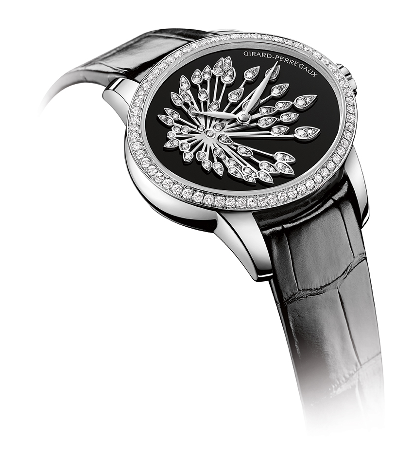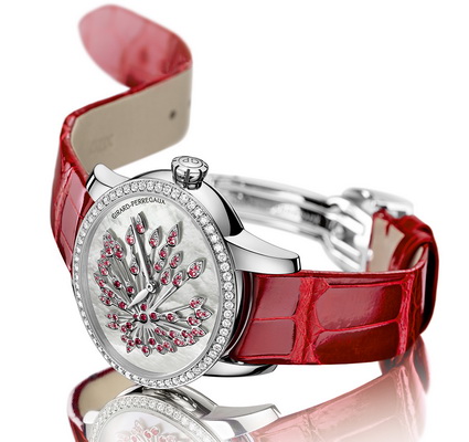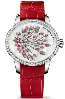 Корпус: 62 бриллианта классической огранки, ~ 0,85 карата Циферблат из оникса: 73 бриллианта классической огранки, ~ 0,36 карата Перламутровый циферблат: 73 сапфира розового/красного цвета, ~ 0,41 карата |