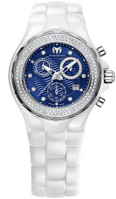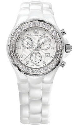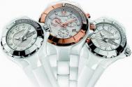 Специально для тех, кто предпочитает ярким летним краскам сдержанное обаяние белого, компания TechnoMarine выпустила элегантные модели из коллекции Cruise Ceramic. Модницы могут выбрать модель с украшенным 34 бриллиантами общим весом 0, 22 карата вращающимся безелем или без драгоценных камней. Так же обстоит дело и с циферблатом, на котором вместо обычных индексов могут красоваться бриллианты. Кроме того, предлагается версия с безелем из розового золота с бриллиантами. Компания выпустила две версии модели: обычный трехстрелочник и хронограф. В первом случае на циферблате модели расположены скелетонизированные центральные часовая, минутная и секундная стрелки, а также апертура даты и месяца на 3 часах, а хронограф предлагает своим владелицам набор из трех счетчиков на 2, 6 и 10 часах и маленькой апертуры даты на 4 часах. |
