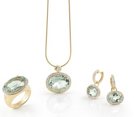 Зеленый аметист, в окружении белых бриллиантов и желтого золота такой ювелирный комплект итальянского ювелирный бренда Alcoro появился и стал одним из любимых в Коллекции герцогини Кембриджской из королевской семьи Великобритании.