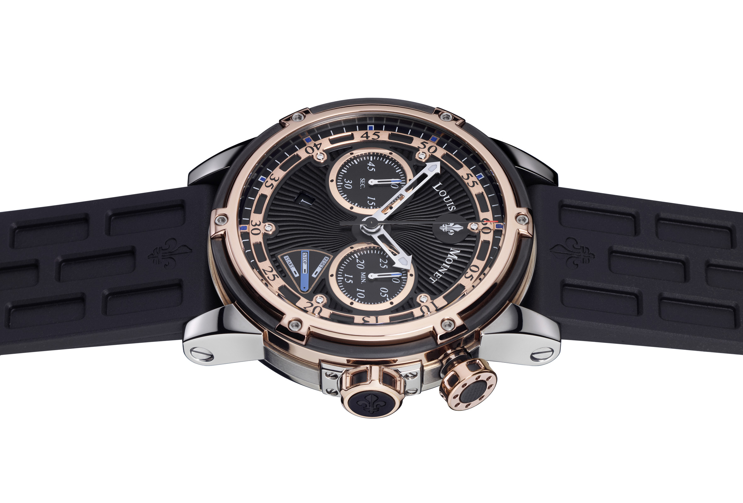 Швейцарская часовая компания Louis Moinet представила свою новую лимитированную модель Jules Verne Instrument III, вдохновленную известным фантастическим романом Жюля Верна "Двадцать тысяч лье под водой", опубликованным в 1869 году. Круглый корпус из нержавеющей стали и титана, или 18-каратного розового золота и титана, диаметром 45,5 мм, толщиной 16,5 мм, 24-миллиметровым расстоянием между дужками, водонепроницаемый до 50 метров. Циферблат гильошированный, часовая и минутная стрелки скелетонизированные с белым люминесцентным покрытием. Сапфировое стекло установлено на передней стороне корпуса (с антибликовым покрытием) и на его завинчивающейся задней крышке. Модель оснащена швейцарским автоматическим механизмом с однокнопочным хронографом Louis Moinet LM30, эксклюзивно выпущенным для бренда, на 27 камнях, с балансовой частотой 28800 полуколебаний в час (4 гц), 48-часовым запасом хода, функциями индикации часов, минут (посредством соответствующих центральных стрелок), секунд (на малом боковом циферблате на 9 часах), даты (в апертуре на 7 часах), а также с хронографом (центральная секундная стрелка, 30-минутный счетчик на 3 часах и указатель "Start-Stop-Reset" на 4 часах). Калибр отделан и декорирован. Ажурный ротор автоподзавода, установленный на шарикоподшипниках, разработан Louis Moinet. Ремешок черный каучуковый с раскладной застежкой. Лимитированный выпуск 365 экземпляров. |