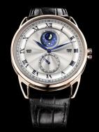 Интерпретация вечного календаря компании De Bethune проникнута духом поэзии и сочетает в себе утонченность часового дела и передовые механизмы. Компания объединила индикаторы фаз Луны, звездное небо и вечный календарь в своих новых исключительных часах DB 25 QP Perpetual Calendar. Безупречно круглый корпус диаметром 44 мм выполнен из розового золота либо представлена версия с корпусом из белого золота. Модель оснащена функциями часов, минут, даты на позиции 6 часов, функцией вечного календаря, индикатор дня которого расположен на позиции 9 часов, а месяца – на позиции 3 часов. Маленький сферический циферблат на позиции 12 часов показывает текущую фазу Луны и високосный год. Ход этой удивительной модели обеспечивает автоматический механизм Calibre DB 2024 QP на 29 камнях, совершающий 28.800 п/к в час. Серебряный гильошированный вручную циферблат покрыт прочным сапфировым стеклом с двойным антибликовым покрытием. Ремешок выполнен из кожи аллигатора с прочной застежкой. |