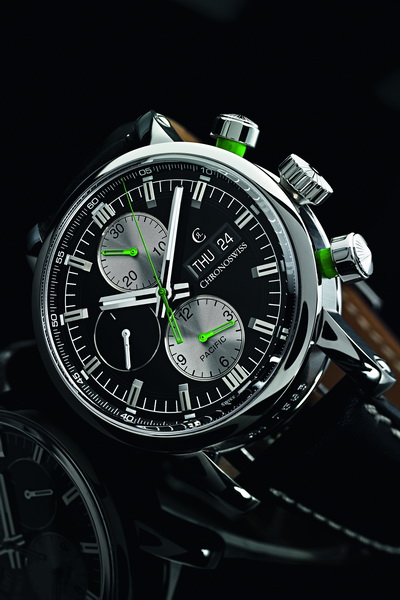 Германская часовая марка Chronoswiss создает классику не только по части сложных механизмов, но и задает тон в стиле спортивных моделей. В этом году Chronoswiss выпустила второе поколение своей легендарной коллекции Pacific, впервые представленной вначале 90-х гг. Одной из ярких моделей обновленной коллекции является Pacific Chronograph, автоматический хронограф с дополнительной индикацией дня и даты. Новинка примечательна не только благодаря своему безукоризненному функциональному наполнению, но и стилю – ретро- очертаниям корпуса родом из 60-х, ярким акцентам наподобие зеленых стрелок и великолепно читаемого циферблата. Это стало возможным благодаря не только сбалансированному дизайну, но и довольно крупному 42,6-миллиметровому стальному корпусу модели. Часы Pacific Chronograph, водонепроницаемые на глубине до 100 м, представлены как с кожаным ремешком, так и на браслете, дизайн которого р азработан Chronoswiss. |