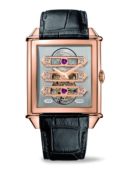 Самая последняя из фирменных разработок – часы Vintage 1945 Tourbillon with three gold Bridges, в которых калибр и механизм турбийона адаптирован к прямоугольному корпусу в стилистике ар-деко.