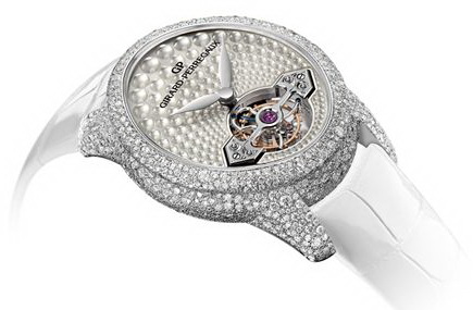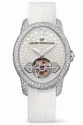 Компания Жерар Перего (Girard Perregaux) дополнила большую коллекцию новинок 2013 года роскошной моделью из класса высокого часового искусства. Эти уникальные часы созданы с применением ряда очень сложных ювелирных декораций, а именно - ручная гравировка перламутра для получения объемного циферблата, инкрустация корпуса более чем одной тысячей бриллиантов специальной техникой "Snow". Корпус выполнен из белого золота 750 пробы, заводную корону украшает розовый бриллиант. Работу часов обеспечивает мануфактурный механизм GP 09700-0011 c запасом хода 70 часов и легендарным турбийоном на золотом "мосте" Золотой бакл так же украшен бриллиантами. |