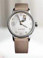 Циферблат как главный и центральный элемент часов подчеркивает и передает всю оригинальность и роскошь новинки Louis Erard Emotion. Циферблат новой Emotion украшен 32-мя бриллиантами. Бриллианты размещены, как по окружности, отображая риски часов, так и вписаны в композицию украшающую часы. Изящный узор в виде изогнутых лучей исходящих от бриллиантовой композиции, размещенной в районе отметки 9-ть, символизирует собой порывы ветра, взметнувшие легкий одуванчик и раздувающие его по циферблату. Помимо этого оригинального брильянтового украшения символизирующего чистоту и легкость, в районе отметки 12-ть размещена изящная апертура в виде полумесяца, через эту апертуру можно наблюдать движение колеса баланса часов. Все это в целом делает обновленные часы Louis Erard Emotion, поистине изящными, элегантными и оригинальными.