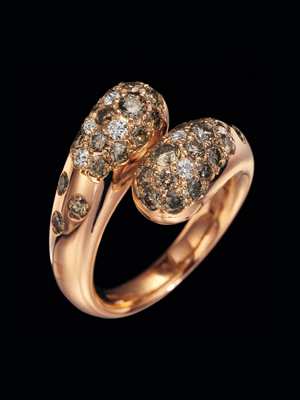 Как и в случае с браслетом, кольцо Iside достаточно умеренно украшено бриллиантами светлого и коньячного цветов, что не делает украшение перегруженным, а сочетание цвета драгоценных камней их размера и цвета розового золота делает украшение одновременно выразительным и сдержанным. Особое внимание заслуживает посадка бриллиантов достаточно искусная и утонченная.
