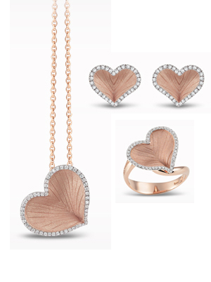 в виде листка сердцеобразной формы, украшенного по контуру бриллиантами. Мелкая россыпь бриллиантов размещающаяся по контуру листка-сердца придает украшению особой яркости и создаёт эффект легкости и игривости. Глянцевые полосы, полученные за счет матирования золота, завершают рисунок листка, создавая эффект природности. Именно этот образ натуральности можно считать центром украшения Lovely (Прелесть)