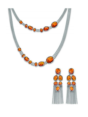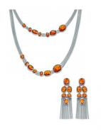 Украшения Raindrop с горным хрусталем насыщенного янтарного цвета представлены в виде ожерелья и серьг. В украшениях, в удивительно красивый тонкий каскад серебряных цепей аккуратно вставлены камни хрусталя. Длинна ожерелья рассчитана на то, что бы украшение можно было обвить вокруг шее дважды, разместив тем самым камни хрусталя в два ряда и предав украшению еще большей выразительности. На серьгах череда тонких и длинных цепочек исходящих от камней придают особой изысканности украшению. Серьги в сочетании с ожерельем создают особый, идеальный ансамбль роскоши и легкости. Оранжевый цвет камней хрусталя и цвет серебра в дуэте придают украшению Raindrop Gucci особый одухотворенный и романтичный стиль. А каскады серебреных цепей, олицетворяющих собой капли дождя, задают украшениям Gucci Raindrop роскошный богемный тон.