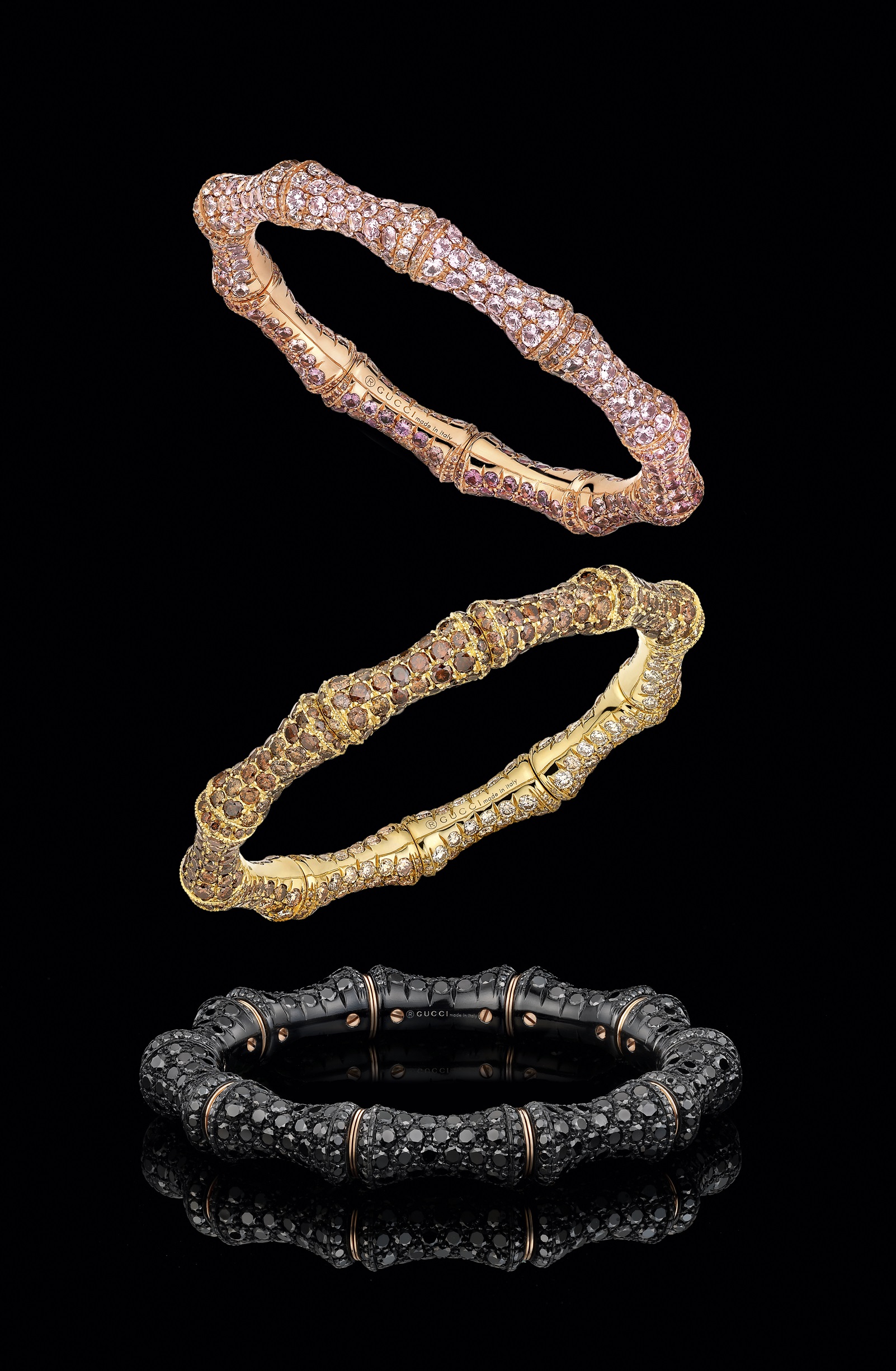 Изысканные рождественские коллекции ювелирных изделий Gucci является свидетельством безграничных возможностями дома, предлагающим творения, которые выражают роскошную палитру драгоценных камней и сложных конструкций. В этом диапазоне несколько эксклюзивных браслетов , которые воплощают в себе пик артистизма, креативность Gucci и мастерство ювелиров. Эти драгоценные произведения опираться на элегантные формы культовых коллекции Bamboo от Gucci, поднимая их в самых эксклюзивных форме, демонстрируя интересные сочетания цветов и огранки камней. Браслеты украшены новой палитрой драгоценных камней, включая редкие черные шпинели, элегантные коричневые бриллианты или гламурные лаванды сапфиры.