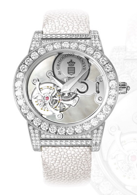 Впитав в себя все мастерство компании De Grisogono, часы Тондо Tourbillon Gioiello выступают как воплощение истории о том, как красота бриллиантов сочетается с техническим совершенством. Впервые De Grisogono создали турбийон специально для женщин. Тондо Tourbillon Gioiello выпущен в серии из трех великолепных часов - елом, черном и коричневом цвете. Особенностью часов является смещенный относительно центра турбийон в положении «8 часов» на роскошном перламутровом циферблате. Часы TONDO TOURBILLON - это союз технического совершенства и ювелирного искусства. |