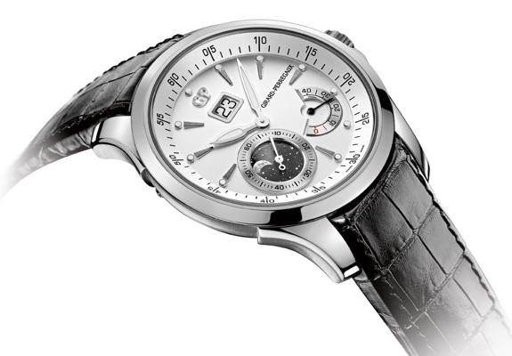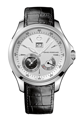 Эти новые часы будут официально представлены компанией Girard-Perregaux на выставке Baselworld-2013. Производитель выпустит три версии Traveller Moon Phases and Large Date: с серым циферблатом и керамическим безелем (Ref. 49650-82-231-HBBA), с опаловым циферблатом (Ref. 49650-11-131-BB6A) и с черным циферблатом (Ref. 49650-11-631-BB6A). Циферблат изготовлен в форме «котлован», т.е. со скошенной внутрь боковой гранью, на которой начертана минутная шкала с индексами и арабскими цифрами. На плоскости циферблата расположены накладные часовые индексы и белые люминесцентные точки, и часовая и минутная стрелки с белым люминесцентным покрытием. Самая выразительная деталь – расположенный между 6 и 9 часами круглый индикатор фаз Луны в виде звездного неба с Луной, окруженный шкалой указателя секунд. Между 4 и 5 часами находится аналоговый указатель запаса хода, а на 12 часах цифровой указатель даты, при создании которого применяет запатентованная технология: он состоит из двух прозрачных матовых дисков с цифрами толщиной лишь 0,10 мм, между которыми почти не видна граница. |