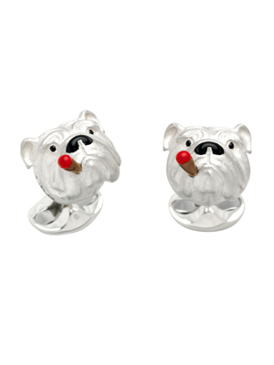 Обратите внимания на оригинальные и выразительные мужские аксессуары от английского бренда с многовековой историей - Deakin & Francis. К примеру, такие запонки, с комичной головой бульдога важно раскуривающего сигару.