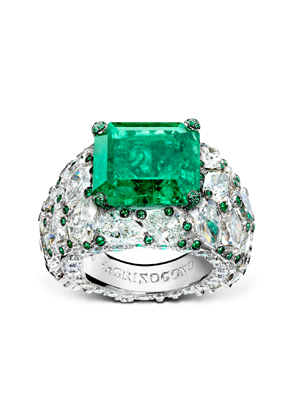 Кольцо в центре с огромным и чистым изумрудом огранки «изумруд» весом 12.,34 карат и усеянное россыпью бриллиантов и изумрудов меньшего размера завораживает своим величием и роскошью.
