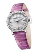 Часы установлены на сиреневый ремешок из кожи аллигатора и обладают классической застежкой изготовленной из 18К белого золота.