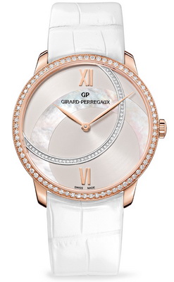 Если бы время имело форму, это несомненно был бы круг. Округленные линии Girard-Perregaux 1966 образуют плавные переходы от корпуса к циферблату, от перламутра к бриллиантам. Ротор за сапфировой задней крышкой задает ритм кружению стрелок на циферблате. За чистой эстетикой циферблата часов Girard-Perregaux 1966 Lady 38 mm, установленного на корпус из розового золота с бриллиантами, кроется сложное механическое творение. Завораживающие своим блеском бриллианты и перламутр завершают танцевальную композицию изогнутых линий. Изысканное сочетание благородных материалов теплых цветов и сияющего циферблата, сатинированного узором в виде лучей, отражает тонкий характер этого часового произведения.