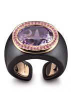 В центре кольца Neraviglia размещается удивительной красоты драгоценный или полудрагоценный, в зависимости от интерпретации, камень. Это может быть большой розовый аметист, или большой топаз, или большой цитрин. Огранка, цвет, чистота камня все это, безусловно, завораживает и привлекает внимание. Центральный камень в зависимости от модели находится в окружении драгоценных и полудрагоценных камней меньшего размера – это могут быть топазы, цавориты, сапфиры, бриллианты.
