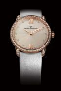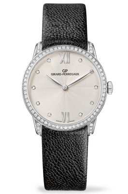 Изящная. Утонченная. Предназначенная для истинных ценительниц часового мастерства. Модель Girard-Perregaux 1966 Lady – наглядный пример того, что механические часы могут быть изысканным драгоценным украшением. Новая модель приводится в действие мануфактурным механическим калибром и отличается искусной отделкой, придающей элегантность течению времени. Настоящий инструмент для обольщения. Корпус часов из розового золота диаметром 30 мм дополнен бриллиантовыми ободком и ушками. Изысканный облик модели подчеркнут чередованием матовых и полированных поверхностей. Циферблат новых часов декорирован гильошированным узором и украшен часовыми метками в виде бриллиантов классической огранки, а также двумя римскими цифрами в положении «6» и «12 часов». Листообразные стрелки с неизменной регулярностью отмеряют ход времени.